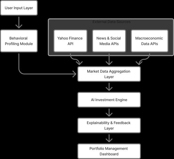 Theintendedmodelcombinesbehavioralfinanceconcepts with reinforcement learning and machine learning algorithmstodevelopaninvestmentadvisorysystemthatis dynamic in nature. The architecture entails seven main layers: Continuous Learning Loop, Portfolio Management Dashboard, Explainability and Feedback Layer, AI Investment Engine, Market Data Aggregation Layer, BehavioralProfilingModule,andUserInputLayer.