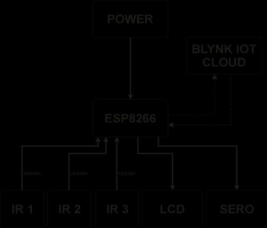 Threeinfraredsensors,anLCDscreen,andaservomotorare all connected to the circuit's ESP8266 NodeMCU, which serves as its primary controller. When cars are found in parkingspaces,theIRsensorsrelaysignalstotheESP8266 viadigitalpins.TheESP8266continuouslyrefreshestheLCD displaytoindicateslotavailabilitybasedonsensorinputs. Additionally,itmanagesaservomotorthatopensorcloses the parking gate automatically when a space becomes available.Furthermore,thesystemusestheESP8266'sbuiltinWi-Fitoconnecttotheinternetandtransmitsreal-time parkingdatatotheBlynkIoTCloud,enablingcustomersto verifyslotstatus remotelythrougha mobileapp.TheVCC and GND pins on the NodeMCU provide power to every component.