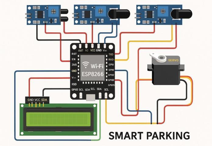 A7805voltageregulatortransformsthe3.7VLi-ionbattery that powers the Smart Parking System into the steady 5V output needed by parts like the LCD display and servo motor. As the main controller, the ESP8266 (NodeMCU) managesthesystem'slogic.Inordertoidentifycarsasthey comeorgo,itinterruptstheinfraredbeamafterprocessing informationfromanIRsensorattheparkingentrance/exit. TheESP8266triggersaservomotortoraiseagate,lettinga carpasswhenparkingspacesbecomeavailable.Theservo closes the gate after a brief pause. The 16x2 LCD display, which indicates parking status (such as the number of availableslotsor"SlotFull"),isupdatedconcurrentlybythe ESP8266. An I2C module connects to the LCD, simplifying wiringandloweringthenumberofpinsneeded.Thesystem mayremotelymonitorparkingavailabilitybysendingdata toaninternetserverorappwithoptionalWi-Ficonnectivity. Jumper wires are used to arrange the complete system, whichmakesmaintenanceandtroubleshootingsimple.