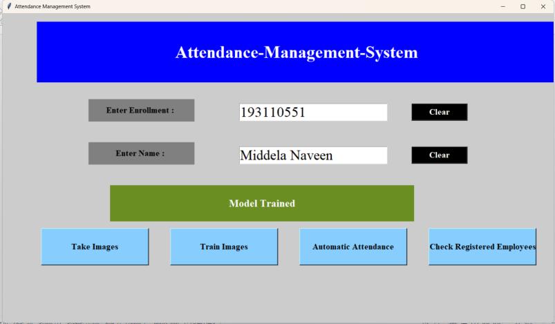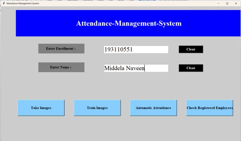After filling the details of employee(i.e Employee ID and Name).it automatically captures the images for haar feature Extraction and stores the images in Training database.