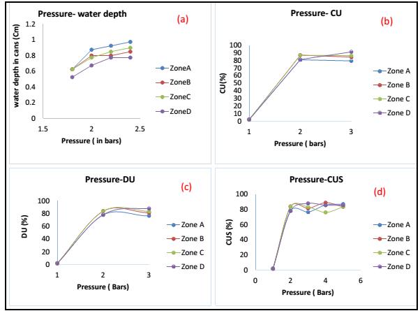 The figure 4 shows the relationship between pressure, water depth and parameters of uniformity Inlet pressure and outletpressureofeachsprinklerlateralevaluatedindifferentfieldzonesweremeasuredtodeterminepressurevariation along laterals. Within this framework, the results showed a correlation between pressure in sprinkler and water depth (Fig4-a).Inaddition,thecorrelationbetweenpressureanduniformityparameters(CU,DUandCUS)wasobserved(Fig4-b, c & d). It is generally accepted that, in order to maintain sufficient uniformity, the limit of discharge varying in different places of laterals should not be above 10% of average discharge because the sprinkler operating pressure impacts the sprinkler discharge rate and amount applied. The pressure variation restrictions shouldn't go over 20% of the average working pressure for better achievement. Greater pressure variation above this threshold would have an impact on the waterdistributionuniformity(DU),causingcertainareasofthesurfacetoreceivemorewaterthanothers.