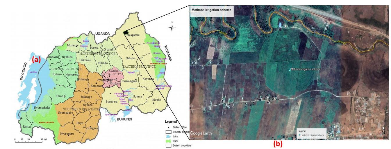 The Matimba irrigation scheme is in Nyagatare District of Rwanda. This area of Eastern Province of Rwanda is situated between 1.0584° S and 30.4574° E with an average elevation of 1513.5 meters above sea level. According to Majumdar (2000),thearea'ssoiltypeissandyloam,anditsinfiltrationrateof17.2mm/hrisregardedtobequick.Theresearcharea experiences varying quantities of light precipitation and hot weather, with an average yearly temperature that ranges between25.3°Cand27.7°C.Thisregionhasacriticalneedforirrigationastheannualrainfallrangesfrom700to900mm (Chandra,2020)andthepotentialevapotranspirationis1337mm(Malesu et al.,2010).