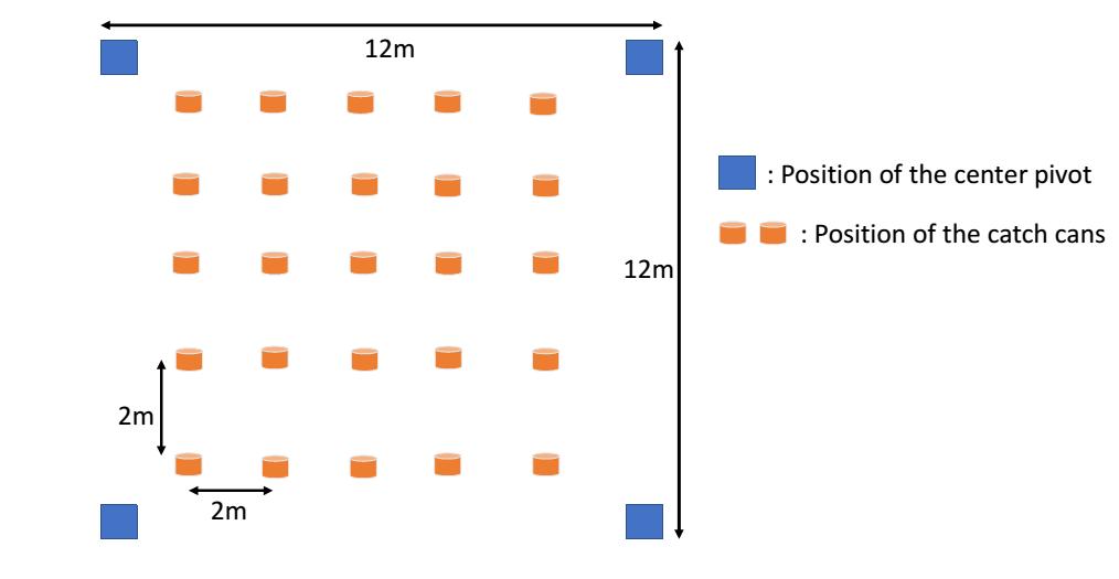 The Catch cans were roughly distributed in a square grid of 2 meters for the square spacing of 12x12 m inside the area surroundedbyfoursprinklers(seefigure2.2).Boththedischargerateandtheoperatingpressureofthesprinklerswere predetermined prior to the start of each test at the hydrant level as well as the pumping station level of the system. The testinvolvedmeasuringthesprinklerheadflowrate,inletpressure,andoutflowpressurealongthelateral.Eachsprinkler lateral that was being examined underwent a test that lasted 30 minutes and reading catch cans took 10 to 15 minutes. Afterthetestwasfinished,agraduatedcylinderwasusedtomeasuretheamountofwaterthathadaccumulatedineach catchcan.Foreverysprinklerlateralevaluated,sameexperimentprotocolswererepeated.