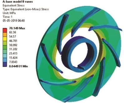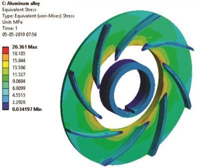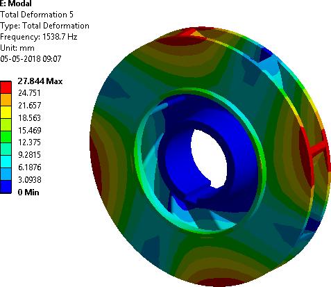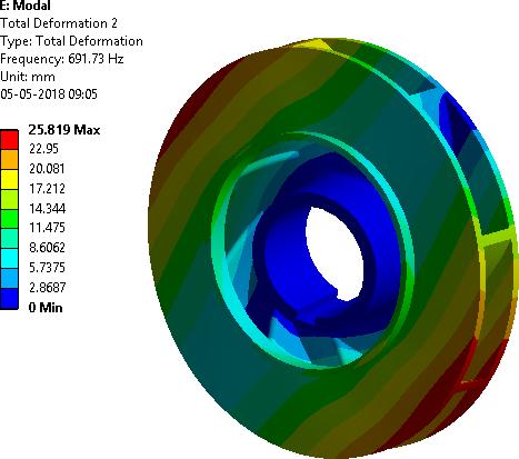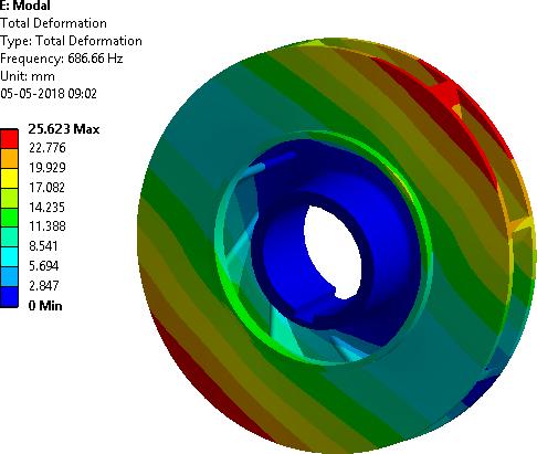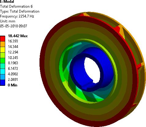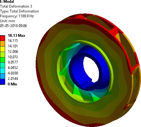 Accordingtostaticandmodalanalysisofthepump impeller, the maximum deflection that can be caused in a metallic pump impeller made of SS material is 3.00mm, which is within working limits. With consideration of working limit, the maximum induced stress for the SS materialis71.02Mpa,whichislessthanthepermittedstress (340Mpa).Therefore,basedonstrengththedesignissecure. Withconsiderationofworkinglimit,themaximuminduced stressfortheSSmaterialis71.02Mpa,whichislessthanthe permittedstress(340Mpa).Therefore,basedonstrengththe designissecure.Ifwelookattheresultsaboveandcompare the corresponding deformation of the SS material to the