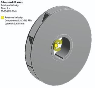 Apply load condition is Rotational velocity and the displacement.Thewaterpressureshouldemergeinpump,to createpressureimpellermustbeinratiocertainRPMasper analyticalcalculation,androtationalvelocityis3600RPM