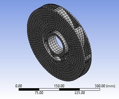 Theabovefigureshowsmeshingonimpellerofsubmersible pump. Meshing used is hexagonal mesh metric, statistic nodesis57644andelements18015.UsingAnalysissoftware ANSYSWORKBENCH.