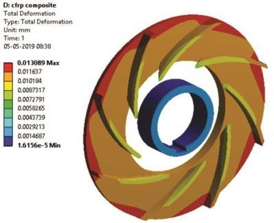 If we look at the results above and compare the corresponding deformation of the SS material to the corresponding deformation of the Al 2014 alloy and the CFRPcompositematerial,theCFRPcompositematerialhas theleastamountofdeformation,sotherearefewerchances that the pump impeller will fail than with the SS and aluminum materials. As a result, the CFRP composite materialincreasesthepump'sstrength.BecausetheCFRP compositematerialpumpimpeller(3.9Kg)weighslessthan theSS(5.58Kg)material,theweightofthepumpimpeller was reduced. Hence, the pump impeller's weight is significantlydecreased.