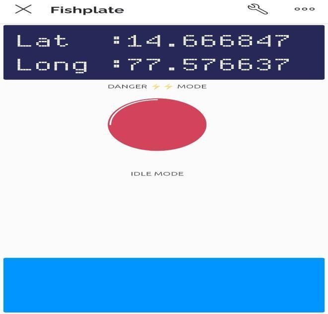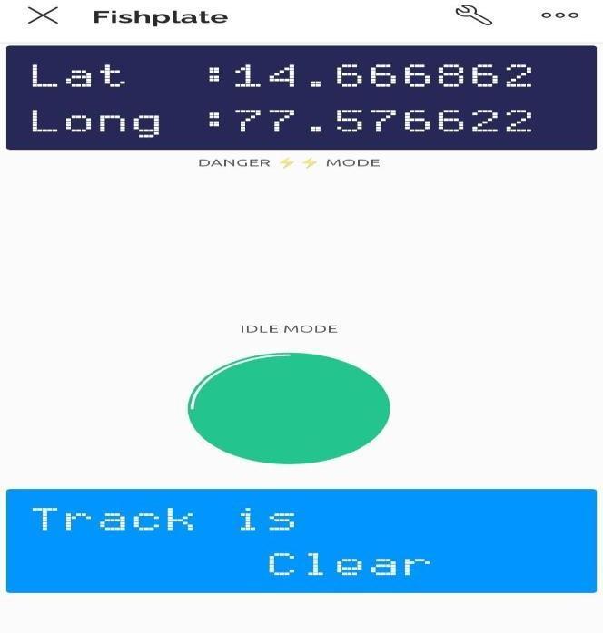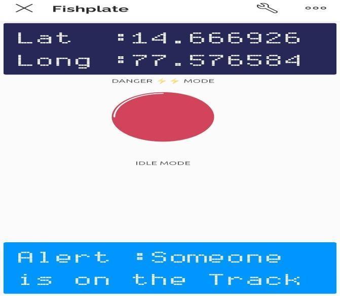 Fig-9,10,11showstheresultoftheconducted experiment. Thesefiguresexplainthemonitoringsystemintheandroid application (Blynk IoT). Fig-9 shows that when a bolt is rotated,itshowstheexactlatitudeandexactlongitudeand alsoindicatesdangermode.Infig-10thealertmessagewas shownassomeoneisonthetrackwhichcanbedetectedby ultrasonicsensor.Thefig11showstheidlemodei.e.,nobolt isrotatedandthereisnochanceoflooseningoffishplates.