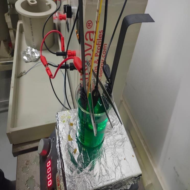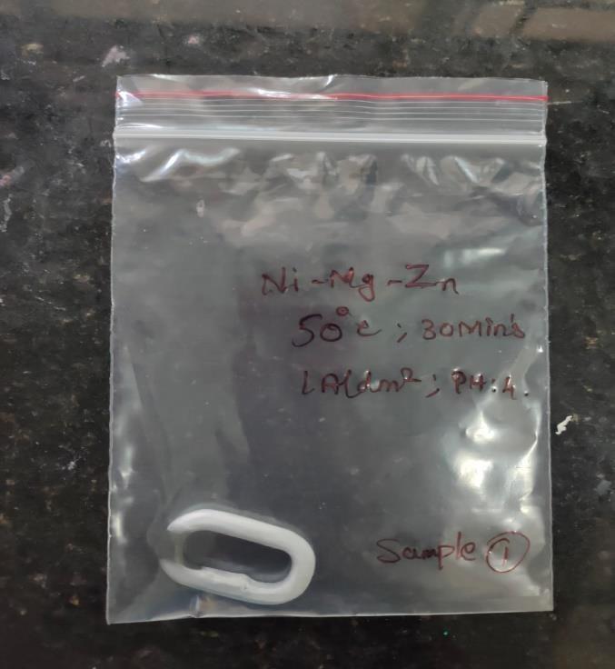 A mild steel chain of diameter 6mm and height of 2.5cm is used as the base substrate. A standard 200ml beaker is used for electrolytepreparation.Initially,thechainsampleiswellcleaned withthehelpofde-ionizedwaterandthen treated withan ultrasoniccleaneratdifferentfrequenciestoremoverustandsurfaceimpurities.Thesamplesaretreatedwithacetonebefore andafterexposuretoultrasoniccleaner.Thesampleisthendippedin10%dilutedHClsolutionfor2minutesto activatethe surface for effective coating. The chain acts as the anode while the stainless steel acts as the anode. The standard current densityof1A/dm2 ismaintainedforcoating.Table-1givestheelectrolyticcompositionofNi-Mg-Znthinfilm,