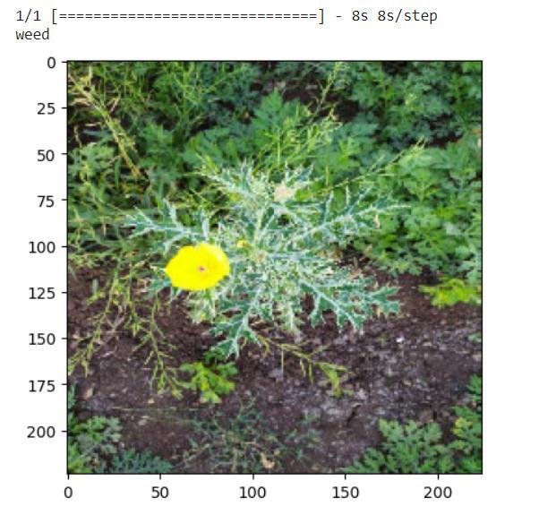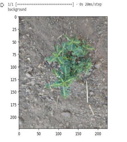 The proposed approach was examined using a variety of samplescollectedfromtheNET.Wetrainedoursystemwith adatasetconsistingof300images.Aftertrainingthesystem with the training images a random image is given as an input.Theinputimageispre-processedusingBinarization techniques. The RCNN algorithm we trained classifies whetherthegiveninputimageisBackground/Crop/Weed asfollows: