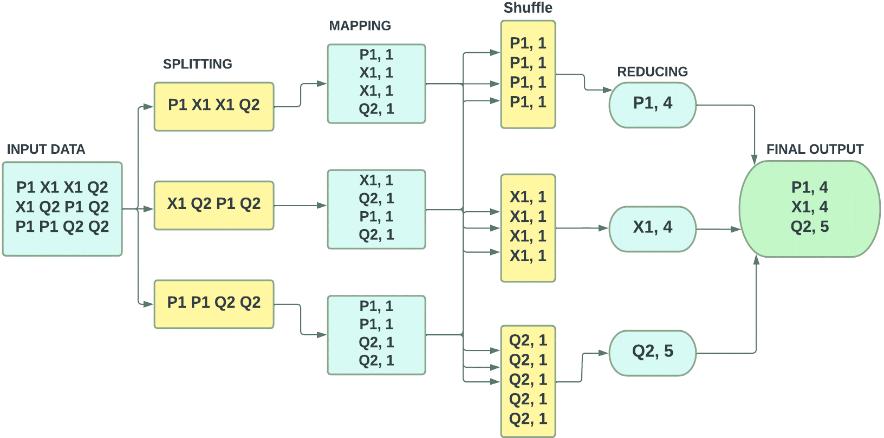 MapReduce is a parallel programming paradigm and processing approach for building distributed applications thatefficientlyhandlelarge volumesofdata onclusters of shared hardware.[35] It was originally developed at Google and is powered by Hadoop, an open-source platform developed by Apache, primarily based on Java. The MapReduce algorithm consists of two key elements: Map and Reduce. Using tuples to represent each element, the Map operation transforms one collection of data into another, while the Reduce operation combines the output of the Map into a smaller set of tuples. The MapReduce paradigm allows easy scaling of data processing across multiple CPU nodes. Mappers and reducers are the basic components used in the MapReduce model for data processing. A MapReduce application can be easily scaled by updating the configuration, allowing it to run on hundredsoreventhousandsofserversinacluster.