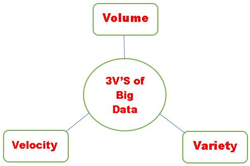 3 V’s, on the basis of which Big Data is defined includes–volume,velocityandvariety.