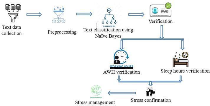 The system employs a Naive Bayes classifier to analyze the text and detect stress levels based on linguistic patterns. Verification follows, checking lifestyle factors like average working hours and sleep hours to identify potential stress triggers. If stress is confirmed, the system recommends management techniques such as time management and relaxation exercises. This integrated approach combines emotional analysis with lifestyle monitoring, offering personalizedfeedbackforeffectivestressmanagement.