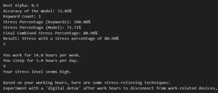 The system evaluates stress at three different levels: low, moderate, and high. If stress is detected in the text, but the working hours remain within the company's set average and the sleep duration is 6 hours or more, the system classifies the stress level as low. In such cases, employees are regarded as managing stress effectively, and the system offers general suggestions to maintain balance based on their working hours. When stress is identified in the text and either the working hours exceed the average or sleep is insufficient (less than 6 hours), the system flags a moderate stress level. In this case, it provides personalized suggestions, helping the employee manage their workload or improve sleep patterns. Finally, if the text indicates stress and both factors excessive working hours and insufficient sleep are present, the stress level is labeledhigh, requiring immediate attention and more focused intervention. If no stress is detected in the text, the system offers suggestions based on working hours alone to promote well-being and maintain a healthy worklife balance. This stress detection system aims to enhance workplace well-being by providing tailored, real-time recommendations that help employees manage stress effectively
