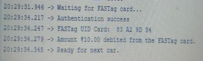 interacts with the FASTag attached to the vehicle. The FASTag responds by sending its unique UID to the reader inaninstantaneousprocess,allowingforseamlessvehicle identification without the need for manual intervention. This automated entry system improves the user experience, reducing congestion and speeding up vehicle entry.