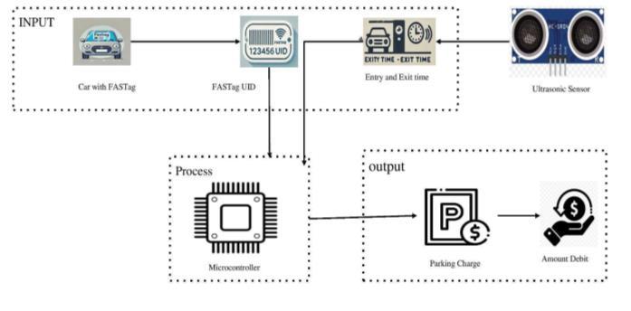 The Above figure focuses on an automated parking fee collectionsystemthatusesRFIDandultrasonicsensorsto track vehicles, calculate parking durations, and debit fees automatically.Thearchitecturereliesoncapturingvehicle entry and exit times using ultrasonic sensors and FASTag UID through Orion RFID tags. This data is processed by a microcontroller, which calculates the parking duration and initiates the payment process via linked bank accounts.