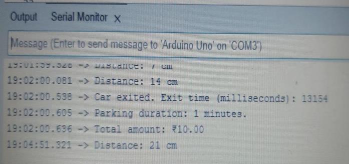 When the vehicle leaves the parking slot, the ultrasonic sensor detects the exit by noticing the threshold value change. The microcontroller captures the exit time using anothertimestamp. To calculatethe total timethevehicle was parked, the system uses the Timediff algorithm. The duration of the parking session is stored, allowing the microcontrollertodeterminetheapplicableparkingfee.