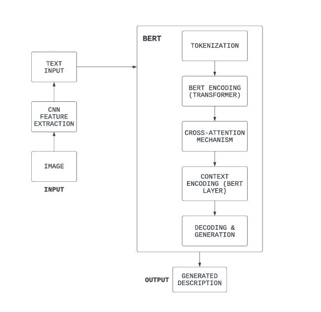 The main goal of this project is to build and evaluate a deep learning framework for image description generation,utilizingCNNforextractingimagefeaturesand BERT for generating natural language descriptions. The proposed approach consists of a two-stage process: the CNN model first processes the image to extract visual features,whicharethenpassedtoaBERT-basedlanguage generation model. This combination allows for highquality, fluent, and descriptive captions that adapt to a wide range of image content. Using popular datasets such as MS COCO and Flickr30k, we aim to assess the effectiveness of our model compared to established benchmarks, measuring improvements in descriptive accuracy, fluency, and computational efficiency. This study’s findings are expected to contribute to multimodal AI research, providing insights into the integration of visual and textual models for practical applications in imagecaptioningandbeyond.