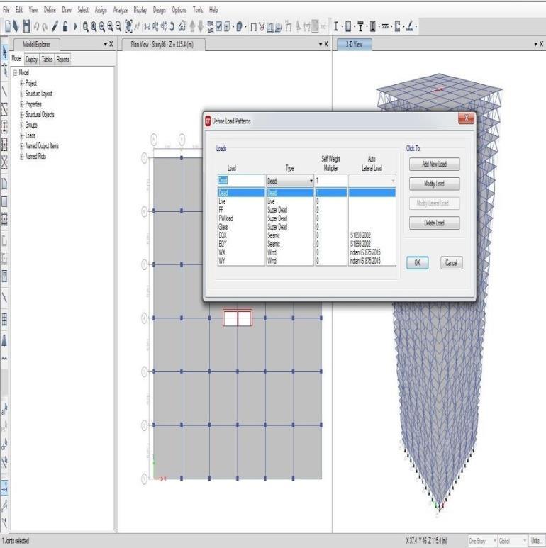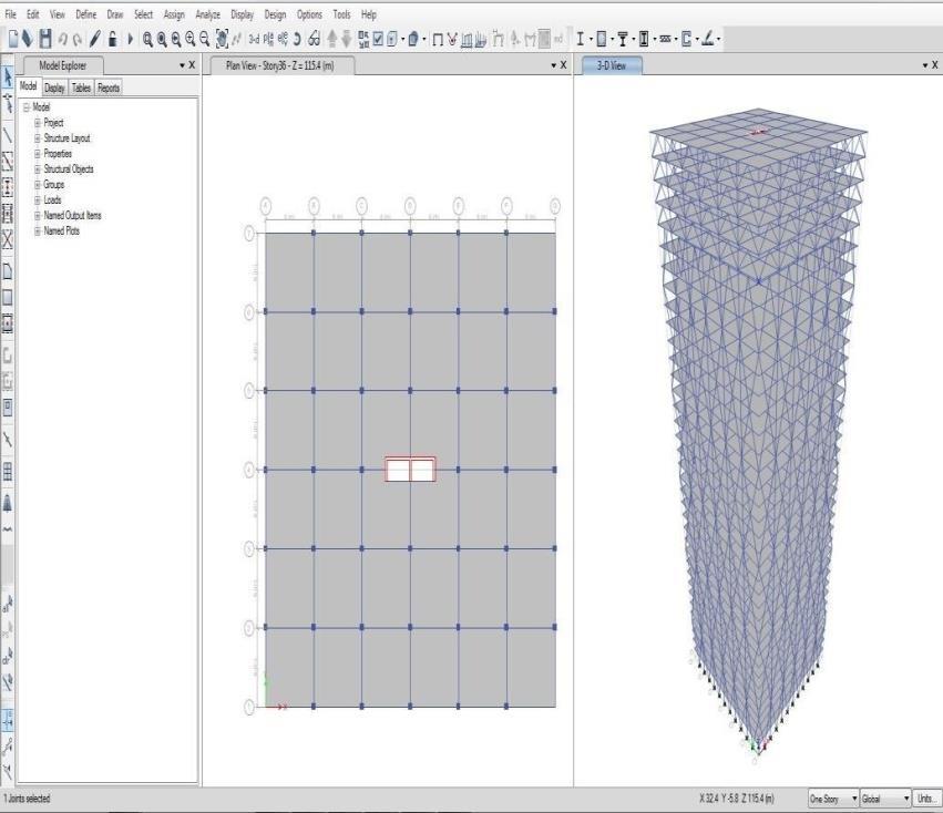 This chapter outlines the modelling and analysis of two G+36 storey building structures using ETABS V16.2.1. The first modelfeaturesadiagridsystemalongthebuilding'speriphery,whilethesecondmodelincludesshearwallsattheexterior framecornersextending6minbothXandYdirections.ThestructuresareanalyzedinseismiczonesIIandIVofIndiawith medium-stiffness soil conditions. ETABS provides comprehensive tools for 3D modelling, linear and non-linear analysis, anddesignoptimization,offeringdetailedresultsandcustomizablereportsforbothstructuralmodels. Fig.1Plan&3Dview ofmodelwithdiagridsandTable.1DescriptionoftheBuildingDataasshownintable