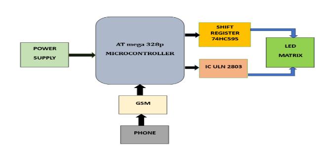 This system uses GSM module, AT- mega 328p microcontroller,LEDMatrix,Shiftregisters,ICULN2803.In thissystemitisusedtodisplaythemessagebyusingaGSM module.By using mobilephone,themessagesendtoGSM module GSM Module consists of SIM card, GSM module’s sim accept the text message from the mobile phone GSM modulesenseditanddisplayitinLEDmatrix.SMPSisused to power the LED Matrix , LED matrix is driven by LED driver. In this system Shift register is used to shift the data from microcontroller depends upon the program. Mobile phone is used for sending text message to GSM to display. Local language can be displayed in this notice board and it isdonebydecodingtechniques.