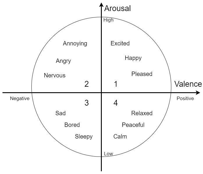 flexibility and interpretability, highlighting the performance and generalizability of each [1]. Emotional judgmentsandphysiological responsesarecollectedfrom participantswholistentodifferentaudiopieces,assessing the emotions evoked without distinguishing between “perceived” and “felt” emotions. This evaluation is often structured around the Valence-Arousal (VA) Emotion Model, which categorizes emotions along two axes: Valence (ranging from pleasant to unpleasant) and Arousal(fromcalmtoexcited)[2].