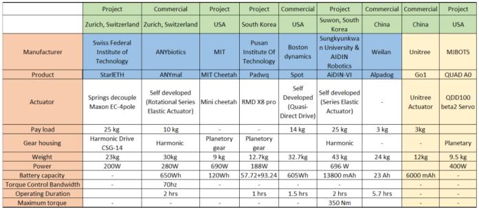 1. Actuators: An Actuator of a quadruped is a deciding factor for comparison because the factors such as speed, torque, power is based on an actuator. (refer fig.1) The actuators used here are from companies such as Cubemars(RMD X8 pro), Unitree actuator, Mjbots (QDD100beta2servo)
