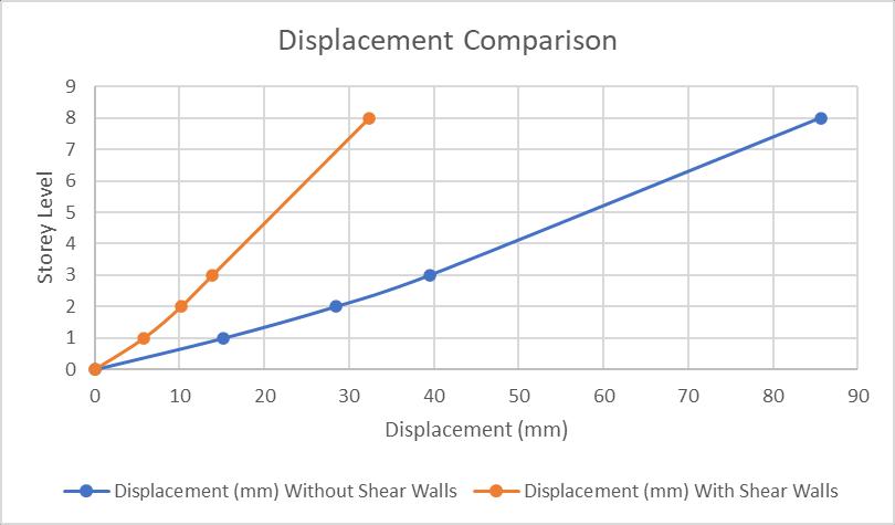 Lateraldisplacementwasanalyzedforbothmodelstoassess theeffectivenessofshearwallsincontrollingthedeflection.