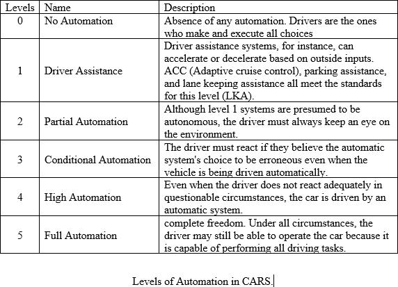 LEVELS: According to SAE International, there are five levels of taxonomy in automation (Society of automotive)