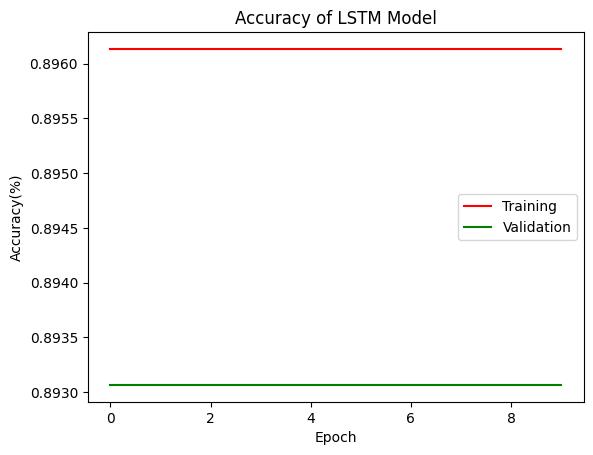 Inboththefigures,XaxisshowsthenumberofepochandY axisshowstheaccuracyinpercentage(%).ForCNNmodel theneuralnetworkistrainedfor100epochandforLSTM modelthetrainingisperformedfor10epoch.Inthiscontext, when we considering the CNN then training accuracy is improving with the epoch and validation accuracy is degrading with the epoch.However,aftersome epochthe validationaccuracybecomesconsistent.Ontheotherhand, whentheperformanceofLSTMmodelhasbeenconsidered than it is observed the training and validation accuracy remains consistent for all the epoch cycles. Therefore, in LSTMthetrainingandvalidationisnotimprovingwiththe provided training. Further for comparing both the algorithms mean accuracy of the models have also been calculated.Themeanaccuracyofboththemodelsaregiven in figure 14 and table 4. In this diagram a bar graph is provided,whereXaxisshowsthealgorithmsimplemented andYaxisshowstheaccuracyintermsofpercentage(%).