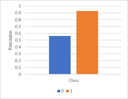 TheclasswiseprecisionoftheCNNmodelisgiveninFig-9 Inthisdiagram,XaxisshowstheclassestobeclassifyandY axisshowsprecisionoftheCNNalgorithm.Accordingtothe obtained results the model is providing higher accurate results for classifying the class label ‘1’ and provides less precisionforclass‘0’.Precisionissimilartotheaccuracybut by only using the precision we cannot decide the best performingalgorithm.Therefore,recallisalsoneededtobe measure. The recall of the CNN model is given in next section.