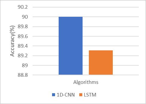 Basedontheperformanceintermsofaccuracyofboththe modelsboththealgorithmsareperformingsimilarbutthe 1D-CNNisprovidinghighaccurateresultsthanLSTM.