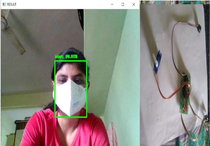 Below Fig.4 & 5 show the scenario entrance of the buildingwhencameracapturetheimage,thiscaptureimage isprocessthenfindwhetherpersonwearingmaskornot.If personwearthemaskandthenimmediatelyopenthedoor i.e turn on the motor. If person not wearing a mask then buzzerisOn,doorwillnotopenandthroughspeakerinform towearthemask.IfTemperatureishighthenbuzzerisOn.