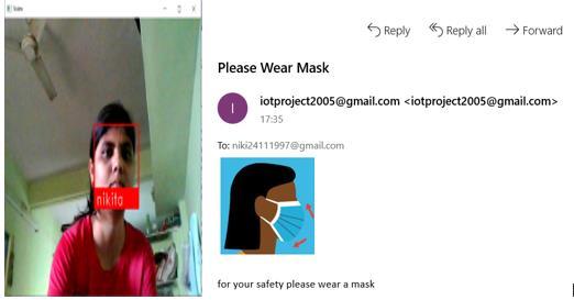 Abovefig.7shownifpersonwithoutmaskoccurthen thenprocessorfindthatpersonindatabaseifpersonshown indatabasethenshownnameofthatpersonincheckbox, speaker will tell that person to wear the mask with name ,sendtheemailtorespectiveperson&buzzerwillon.Ifthat personnotshownindatabasethenonlyspeakerwilltellthat person to wear mask without name & buzzer will on .OtherwisebuzzerwillremainOff.Ifmorethanoneperson occurincamerathenspeakerwillannouncetowearmask butwithoutname.