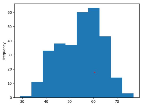 The histogram depicts the frequency distribution of patient ages in the dataset. The majority of patients fall within the age range of 50 to 60 years, indicating that middle-aged and older individuals are more common in this heart disease dataset. There is a gradual increase in frequency from age 40, peaking around the 55-60 age group,andthentaperingoffafterage65.Thisdistribution helps in identifying the target age group most affected by heart conditions, which can assist in focusing diagnostic andpreventiveefforts.