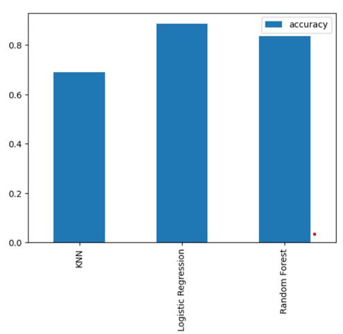 The bar chart represents the accuracy of three machine learning algorithms used in the project: K-Nearest Neighbors (KNN), Logistic Regression, and Random For est. Among the models, Logistic Regression shows the highest accuracy, followed by Random Forest, while KNN has the lowest. This comparison highlights the su perior performanceofLogisticRegressionforthedatasetusedin this study, making it the most reliable model for disease prediction. The difference in accuracy show cases the effectiveness of different algorithms in handling medical dataandmakingdiagnosticpredictions.