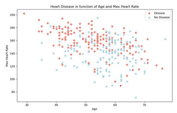 The scatter plot illustrates the relationship between age and maximum heart rate in individuals with and without heart disease. Red dots represent patients diagnosed with heart disease, while blue dots indicate those without. The plotshowsthatpeoplewithheartdiseasegenerallyhavea lower maximum heart rate across different age groups, compared to those without heart disease. The trend suggests that as age increases, the maximum heart rate tendstodecrease,withheartdiseasepatientshavingmore restricted heart rates. This visualization helps in understandinghowheartratemetricscorrelatewithheart diseasediagnosis.
