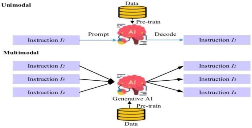 Generative AI can be applied to audio applications like music production and speech synthesis. One of the most well-known examples, the Wavenet model, can create realistic-soundingartificialmusicandvoice.As illustrated in Fig. 5, there are two primary types of generative AI models:single-modal andmulti-modal.Whilemulti-modal modelscantakeinputfrom multiplesourcesandproducea variety of output forms, single-modal models get instructions from input types that are identical to their output[17–19].