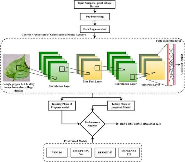Tasksaremoreaccuratewithtransferlearning[22],sincethemodelcanbetaughtbyfreezingeithertheinitialorlastlayers. Themodelparameterscanthereforebemaintainedandadjustedforfeatureextractionandclassificationbyfreezingthelayers [29].Inordertoimproverecognitionandclassificationaccuracyandreducetimecomplexity,weconductedacomparative performanceanalysisofvarioustransferlearningmodelsusingdeepCNNs.Figure3showsourworkflowarchitecture.The PlantVillagedatasetandpre-trainedCNNmodels,includingVGG-16,DenseNet-121,ResNet-50,andInceptionV4,wereusedin thetests.