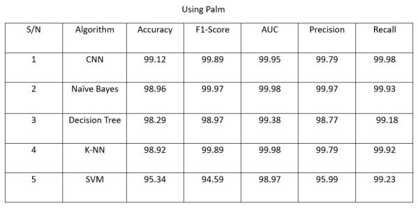 Thestudyaimedtodetectanemiausingmedicalimagesof conjunctiva, palpable palm, and fingernail color from 710 participants. Models were trained, validated, and tested, showing significant results. Naïve Bayes achieved the highest accuracy (98.96%) on palpable palm, while CNN had 99.12%. SVM had the lowest accuracy (95.34%). No significant variations were observed between fingernail color and conjunctiva images. The palm was found to be the most effective in detecting anemia, as supported by previous studies. The extensive and diverse dataset used in this study, publicly available for future research, contributedtoitssignificance.Theresultsemphasizedthe palm's accuracy, particularly in children under 6, and highlighted CNN's superior performance in conjunctiva andfingernailcolordetection.NaïveBayesperformedbest onthepalpablepalm.