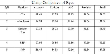 Several studies compared the conjunctiva's color with bloodparametersandpatientattributes,resultinginvaried accuracylevels.Anovelpipelinebasedonscleraandblood vessel color achieved 86.4% accuracy. Convolutional neural network (CNN) models, including one with batch normalization layers, demonstrated cost-effective and controllable applications with accuracy up to 89.33%. OtherstudiesexploredtheapplicationofANNforHblevel estimation and achieved a sensitivity of 95.50%. Comparisons with laboratory tests showed promising results, with sensitivity and specificity ranging from 77.58% to 91.89%. Some studies proposed using the conjunctivaalone,whileothersrecommendedcombiningit with the palpable palm for increased reliability # [4]. Additionally, an automated system for cataract disease detectionusingfundusimagesachievedhighaccuracywith deeplearningarchitectures.