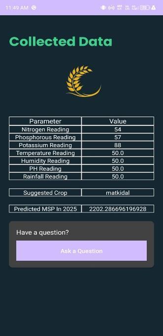 The frontend of our system is an android application developed in Java, providing a robust and platformcompatible interface for users. This application facilitates data input by allowing users to upload soil nutrient levels (Nitrogen, Phosphorous,Potassium) andenvironmental data such as temperature, humidity, and rainfall. The backend utilizes Flask, a micro web framework, to manage incoming requests and generate responses. Requests sent from the frontend contain soil and climate parameters, while responses include crop recommendations generated by the machine learning model and predicted minimum selling pricesfortherecommendedcrops.