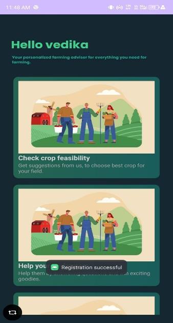 In the Check Crop Feasibility section, farmers input soil andclimatedata,whichthe RandomForestclassifierusesto predict suitable crops. This model demonstrated high accuracy in real-world tests. The Help Your Co-Farmers section allows farmers to ask and answer questions, integrating local knowledge with AI recommendations. The Reports section combines these insights, providing comprehensive crop feasibility and profitability analyses usingARIMAmodelforecasts.