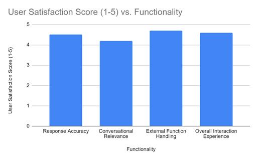 Scenario Testing: The system was tested across various user interaction scenarios to evaluate its robustness and versatility. The AI system performed well in handling different types of queries, including general knowledge questions, contextual dialogues, and external function requests. Error analysis revealed a few instances of irrelevant or incorrectresponses, whichwereanalyzed to identifycommonpatternsandpotentialimprovements.