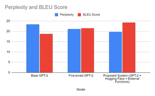 Quantitativeanalysisusingmetricssuchasperplexityand BLEU scores indicated that the proposed system outperformed traditional chat systems. The model demonstrated lower perplexity scores, suggesting better language generation quality, and higher BLEU scores, indicating closer alignment with human-generated text. Userfeedbackandscenariotestingrevealedhighlevelsof satisfaction with the system's performance. Users appreciated the system's ability to handle diverse queries andprovideaccurate,contextuallyrelevantresponses.The system'sresponsivenessandaccuracyinhandlingexternal function requests were also highly rated. When benchmarked against existing chat systems and baseline models, the proposed system showed significant improvements across key performance indicators, underscoring the effectiveness of combining advanced NLP models with external function simulations to create sophisticatedAI-drivenchatsystems.