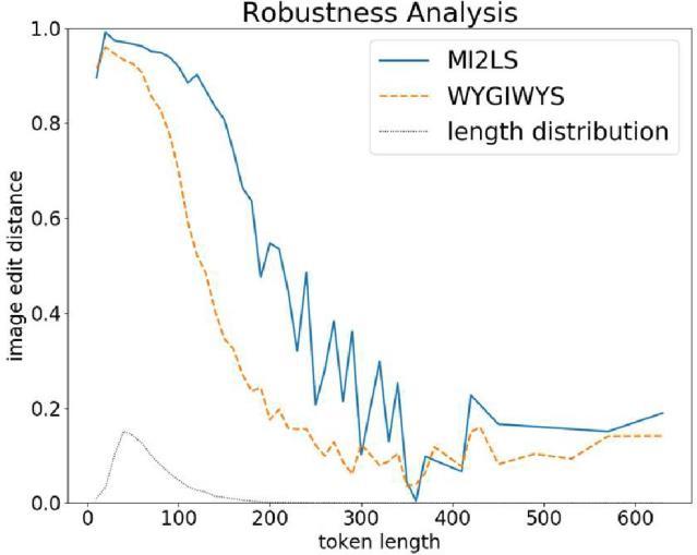 In the following, we compare the robustness of our model toWYGIWYS[2]intermsofsequencelength.Thesequence lengths are quantized by using bins of size 10, and the performancemetricisreportedas themeanofthepicture edit distances inside a bin. Figure 3 Illustrates the performance of the two models. Both are worse than one would like for sequence length, but are apparently improvingatdifferentrates.Thetestperiodwillalsoserve as a mechanism forevaluating thetwomodels onsamples ofunknownsofunknowndurations.Thescoresforouredit distance vs. [2] for a 150-character sequence are 0.79 and 0.43, respectively, and at a 200-character sequence, they are 0.54 and 0.17, respectively. Our model