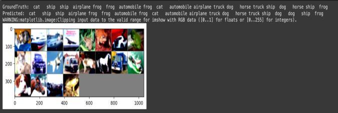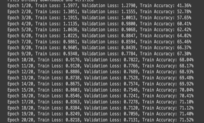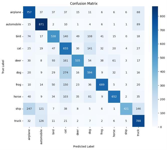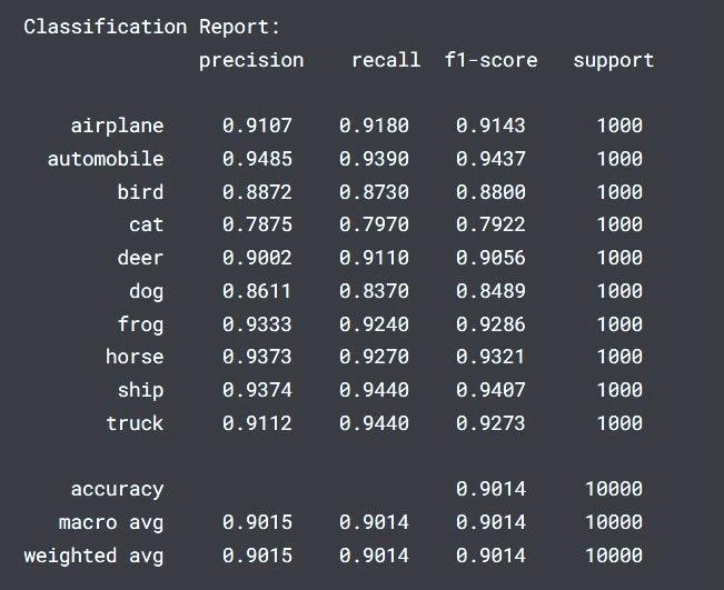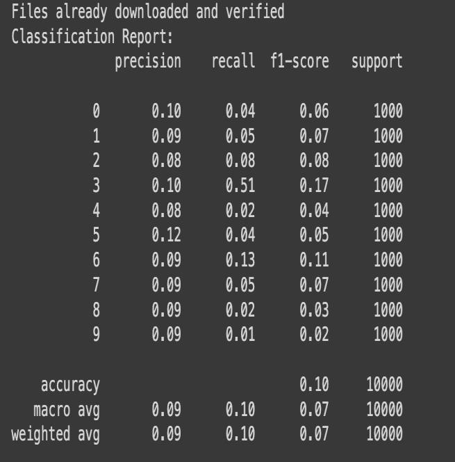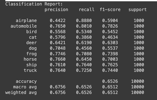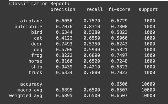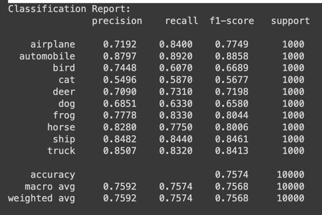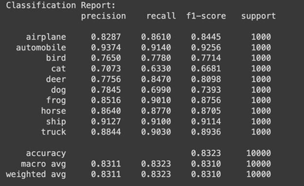 After 20 Epochs training, the model achieved over 83% accuracy.Fromthereport,weseethatthemodeloptimally classifiescertainclasseslikeAutomobiles,ships,andtrucks. However, it struggled to classify bird, cat, and dog images showing further need for improvement and adjustments. TheaverageF1-scoreofthemodelwas0.8310.
