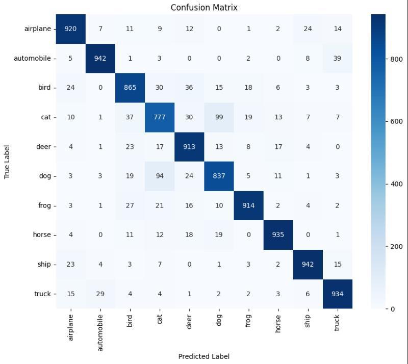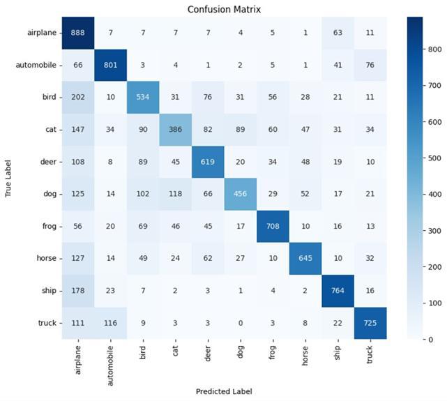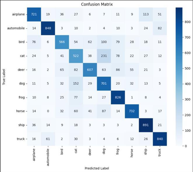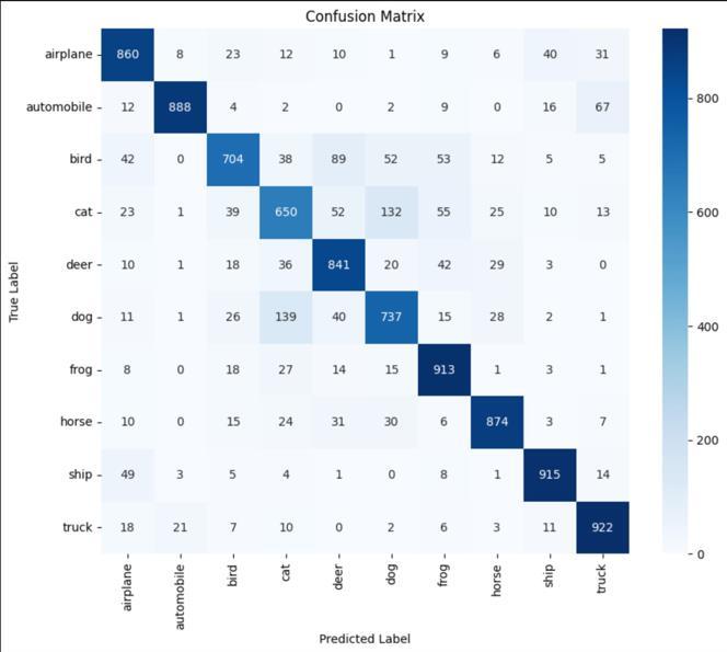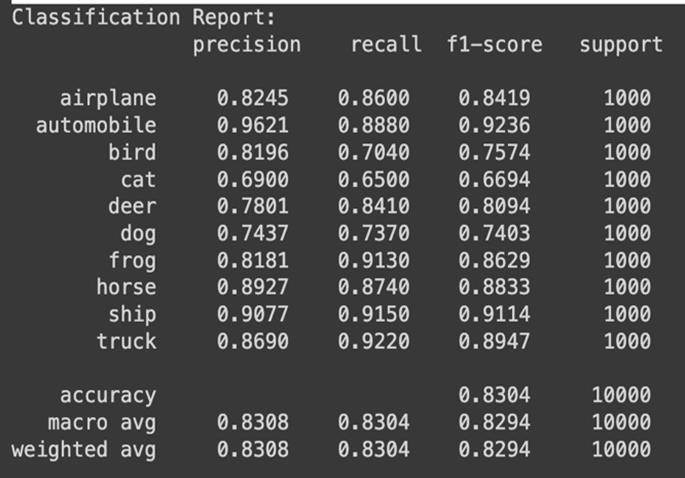 The model achieved over 83% accuracy in classifying the imageswithanaverageF1-scoreof0.8294and0.8304recall score.Itshowedastrongperformanceinclassifyingclasses like Automobile, Ship and Truck with Automobile class having96.21%precisionand88.80%recall.ClassesBird,Cat and Dog show low precision and recall hinting need for improvementandadjustmentstothemodel.