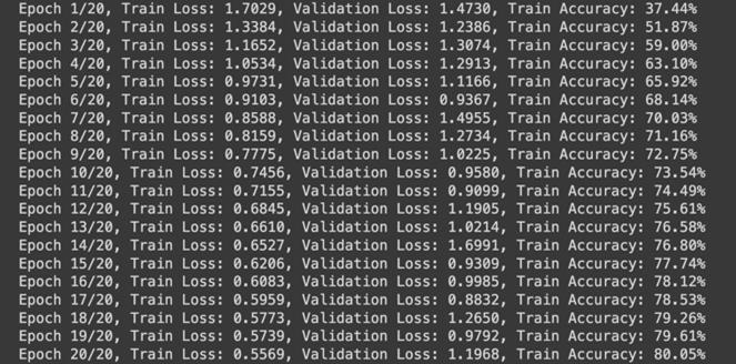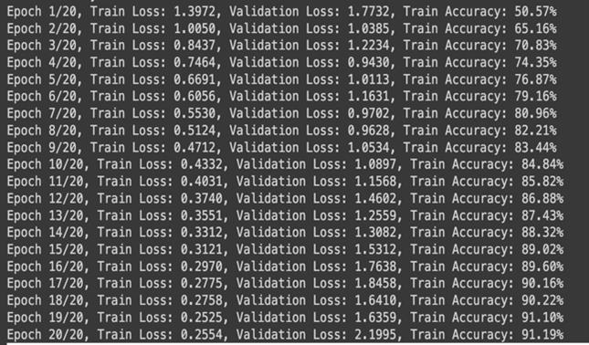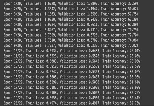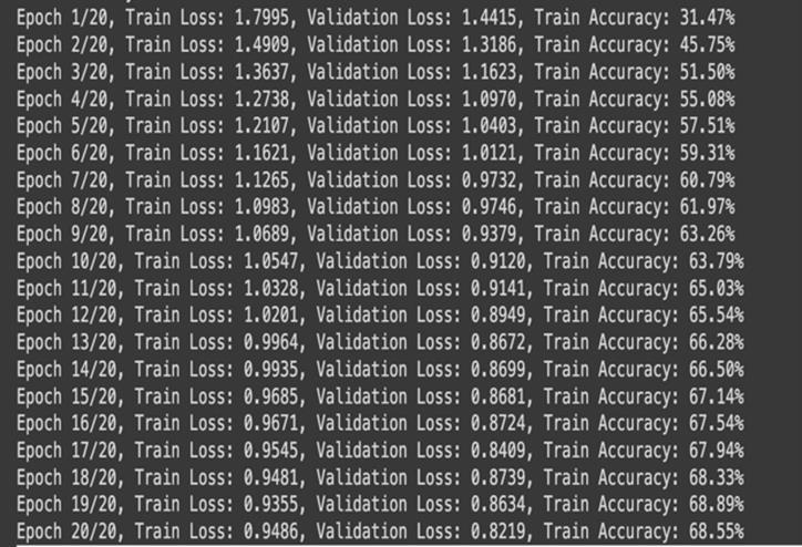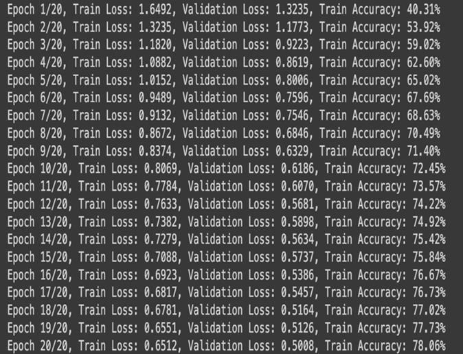 Themodel’strainingaccuracyincreasedfrom40%toover 71% after 20 epochs. Simultaneously, training loss decreased from 1.5977 to 0.8218. Overall, the model achieveda weightedaverageprecisionof0.7592, recall of 0.7574, and F1-score of 0.7568, indicating balanced performance across most classes, yet also shows much neededimprovement.