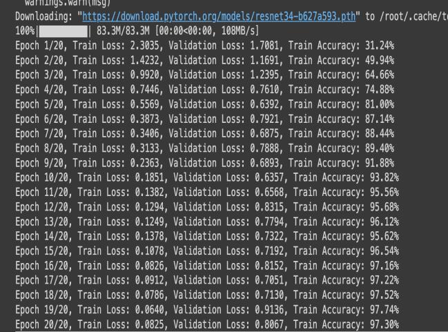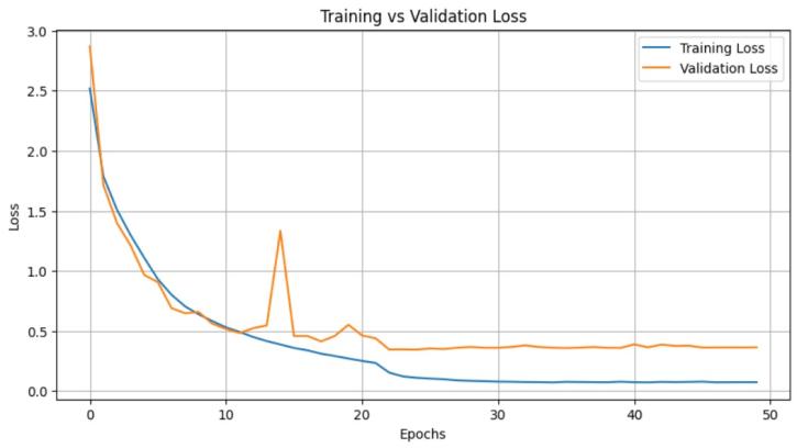 The graph shows the training and validation loss of a ResNet-34 model over 50 epochs. Initially, both losses decrease rapidly, indicating that the model is learning effectively.Aroundepoch10,thetraininglosscontinuesto steadilydecrease,suggestingthemodelisfittingwelltothe training data. However, the validation loss plateaus and showsfluctuations,withanoticeablespikearoundepoch15, indicating potential overfitting. Beyond epoch 20, the validationlossremainsconsistentlyhigherthanthetraining loss, which signifies that the model is learning to fit the trainingdatabutstrugglestogeneralizetothevalidationset.