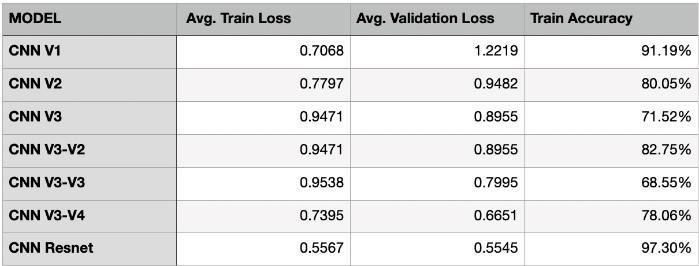 The tablesummarizes the performanceofvarious CNN modelsthatweretrainedandusedforthispaper.Amongst thesemodels,ResNetemergedontopachievingthelowest average training and validation losses and the highest trainingaccuracy,recallandF1-score.Thissuggeststhatthe ResNetarchitecturewasparticularlyeffectiveinlearningthe underlying patterns in the Cifar10 data. While CNN V1 exhibitedhightrainingaccuracy,itsufferedfromoverfitting, as evidenced by the significant gap between training and validationloss.Othermodels,suchasCNNV2andCNNV3, demonstrated moderate performance, with variations in trainingaccuracy.DifferentvariantsofCNNV3showedmixed results, indicating that architectural modifications did not consistently improve performance. Overall, ResNet architecture's superior performance highlights its effectivenessinclassifyingCifar10images.